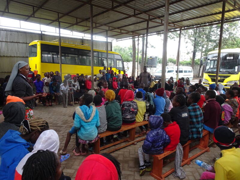 Als het dan gaat regenen gaan de schoolbussen naar buiten zodat de kinderen onder droog op hun maaltijd kunnen wachten.